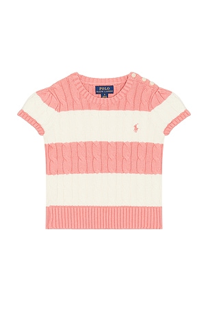 Short Sleeve Cotton Cable Knit Striped Pullover Sweater in Pink